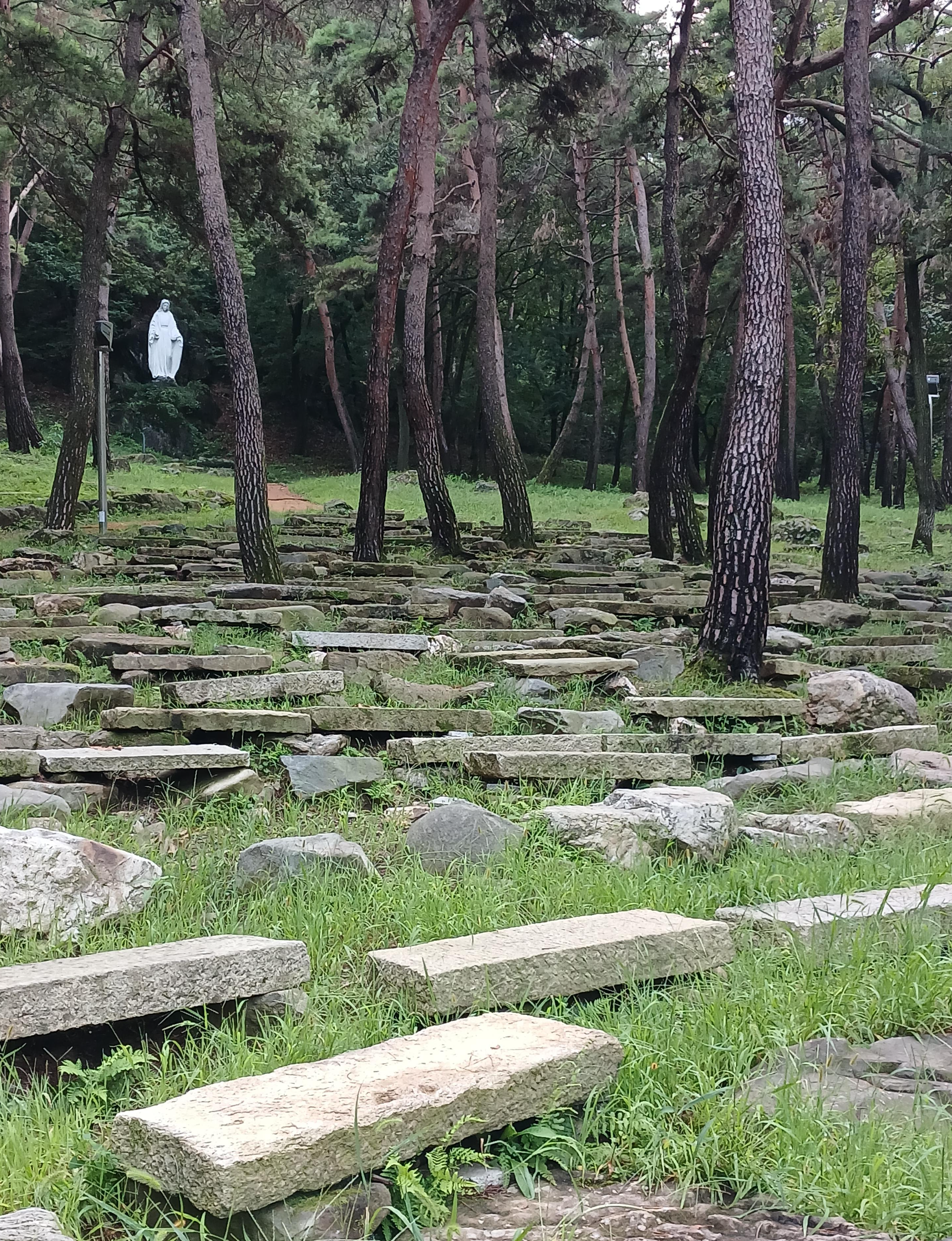산상제대 위에는 큰손성모님상이 서 있고 그 아래쪽으로 많은 사람들이 앉을 수 있는 돌의자가 가지런히 놓여 있다.