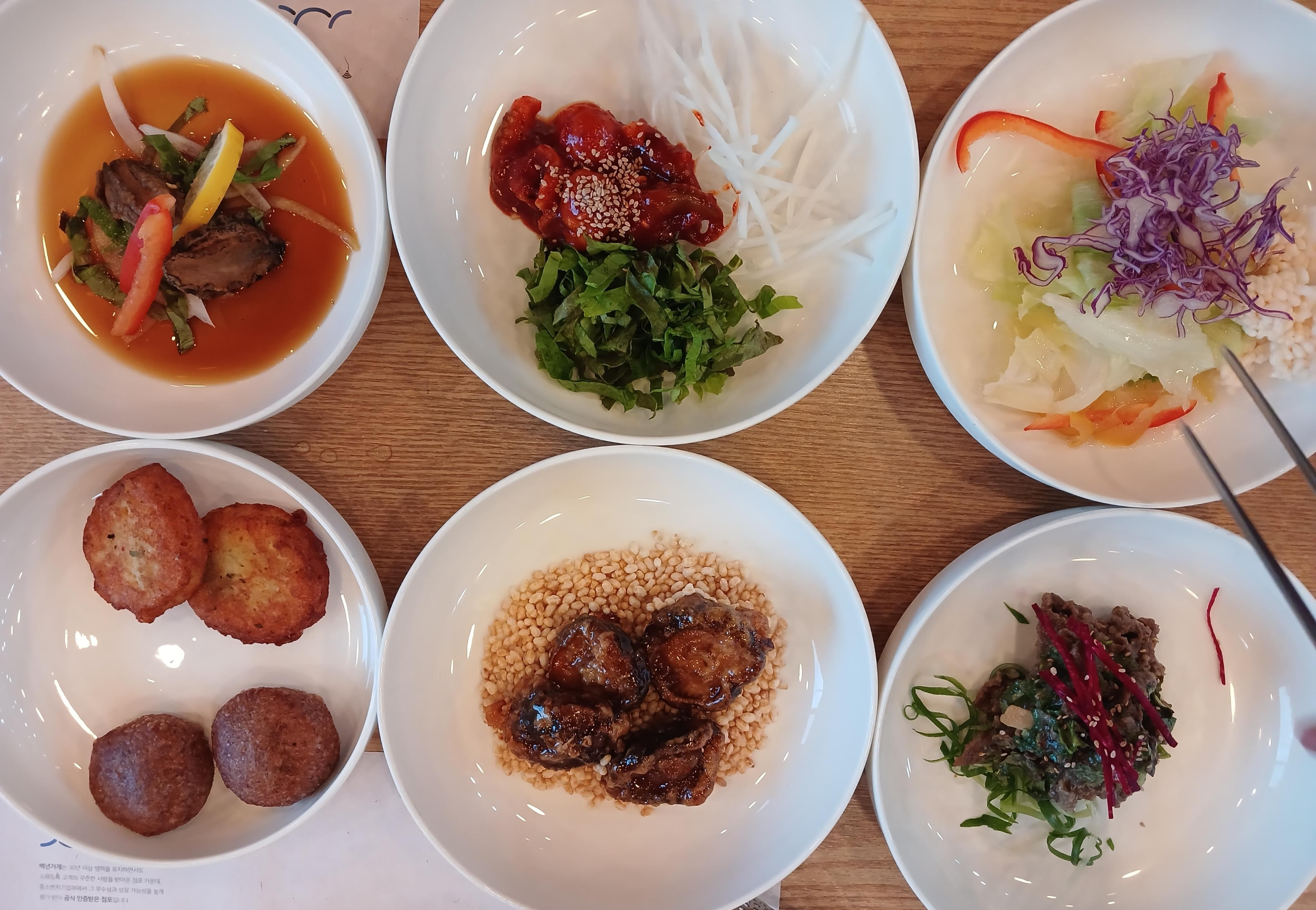 전복장에 누룽지 샐러드, 잡채, 표고버섯 탕수육, 육회, 수수부꾸미 등등.