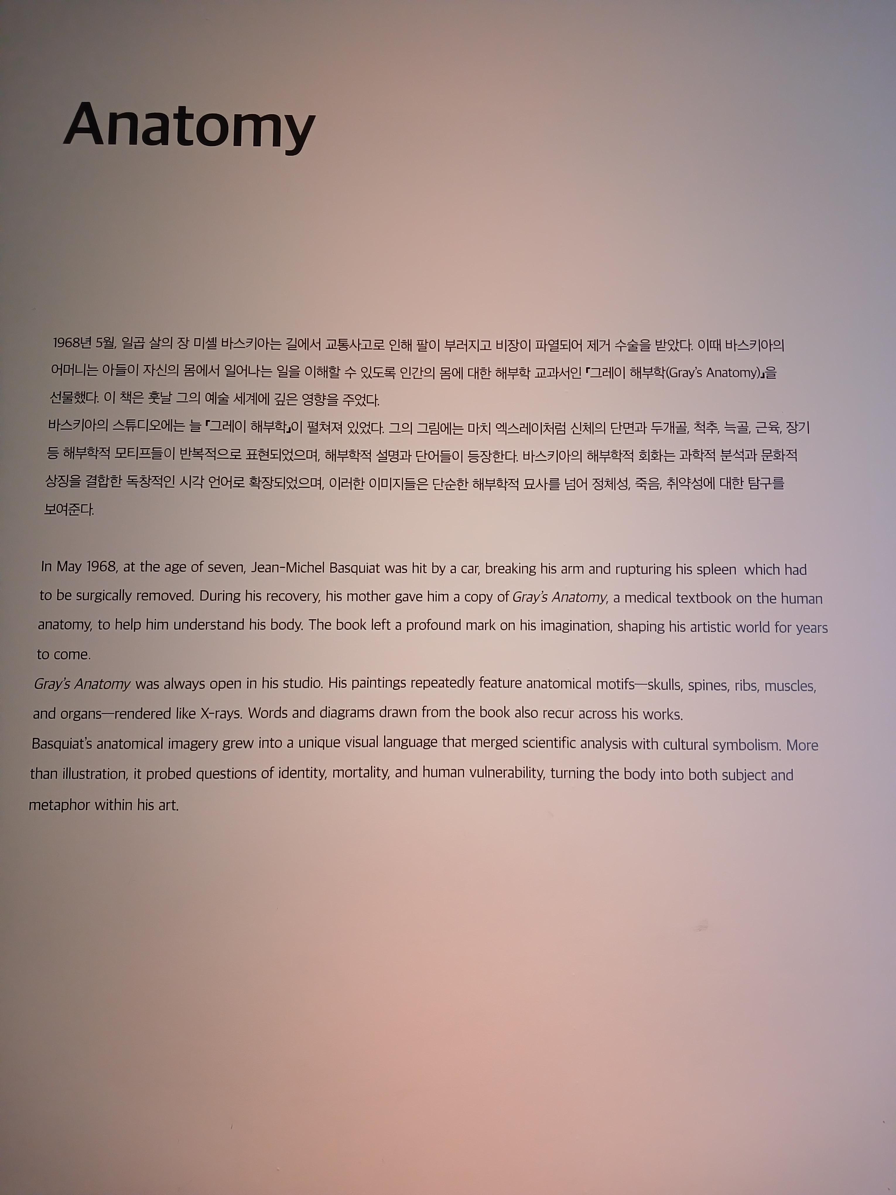 병원에 입원해 있을 때 어머니가 바스키아에게 어떻게 치료가 되는지 알려줄 겸 해부학 책을 사다 주었는데 그 후 바스키아는 그림에 해골이나 사람의 뼈를 많이 그린다.
