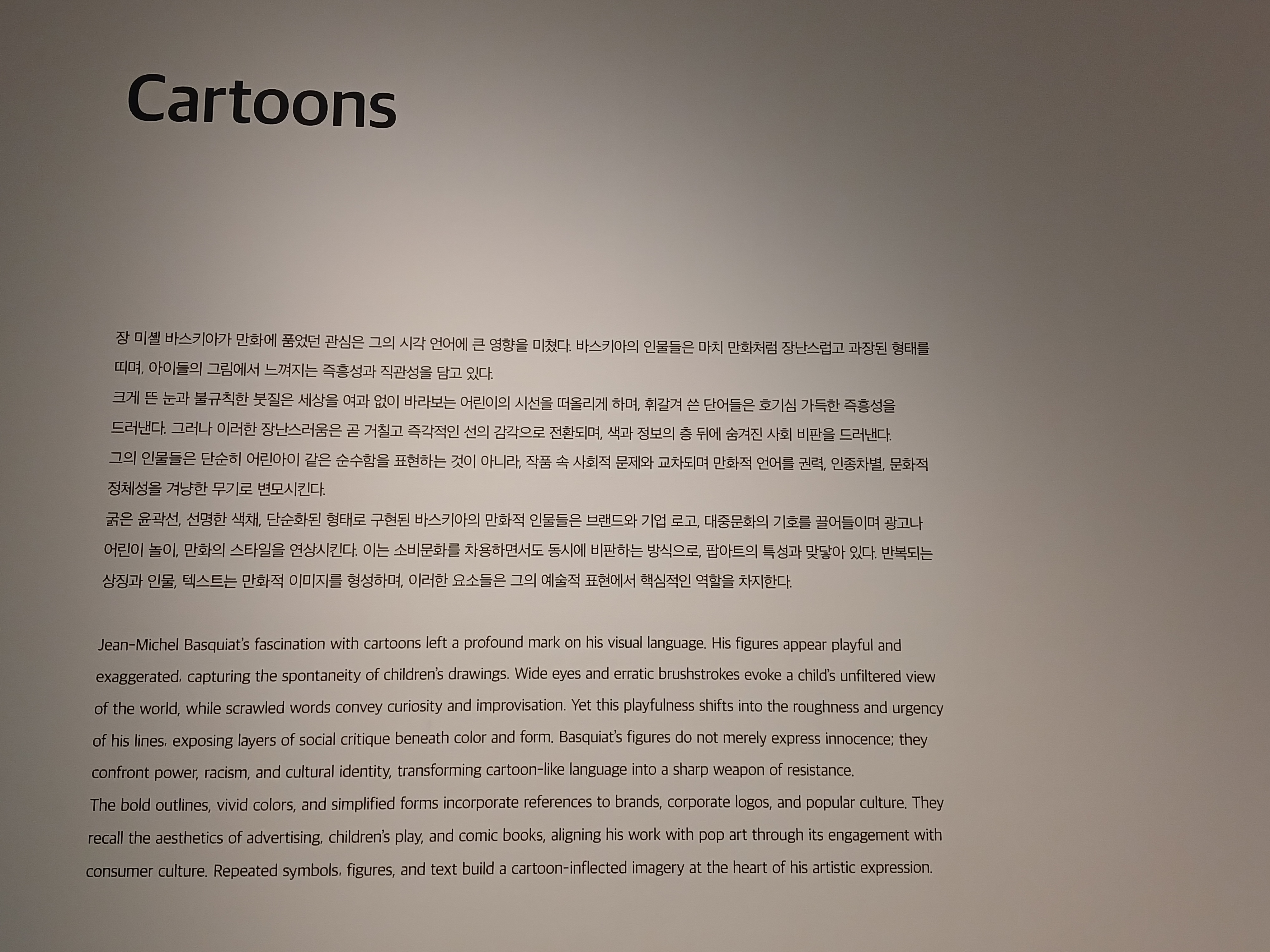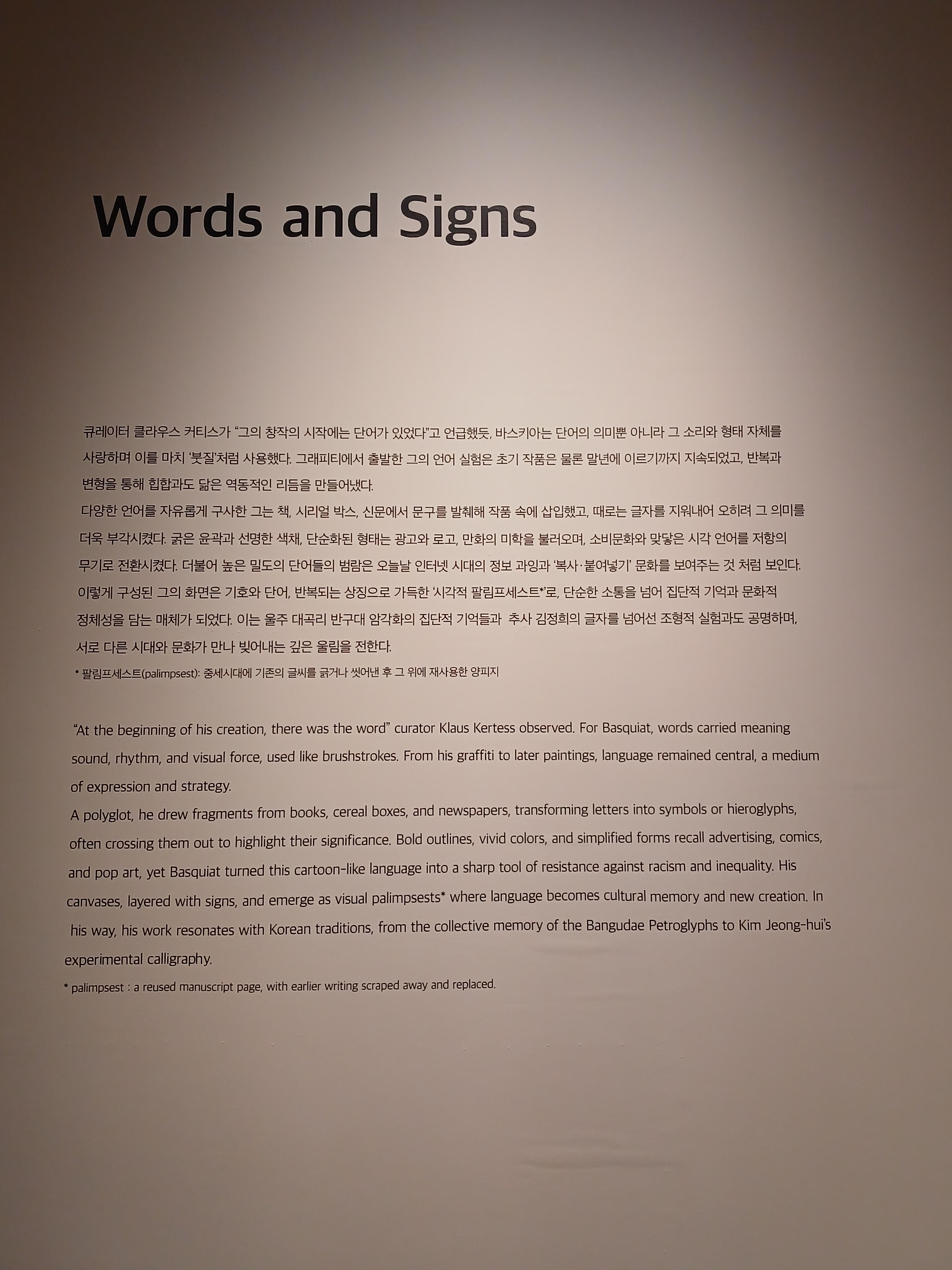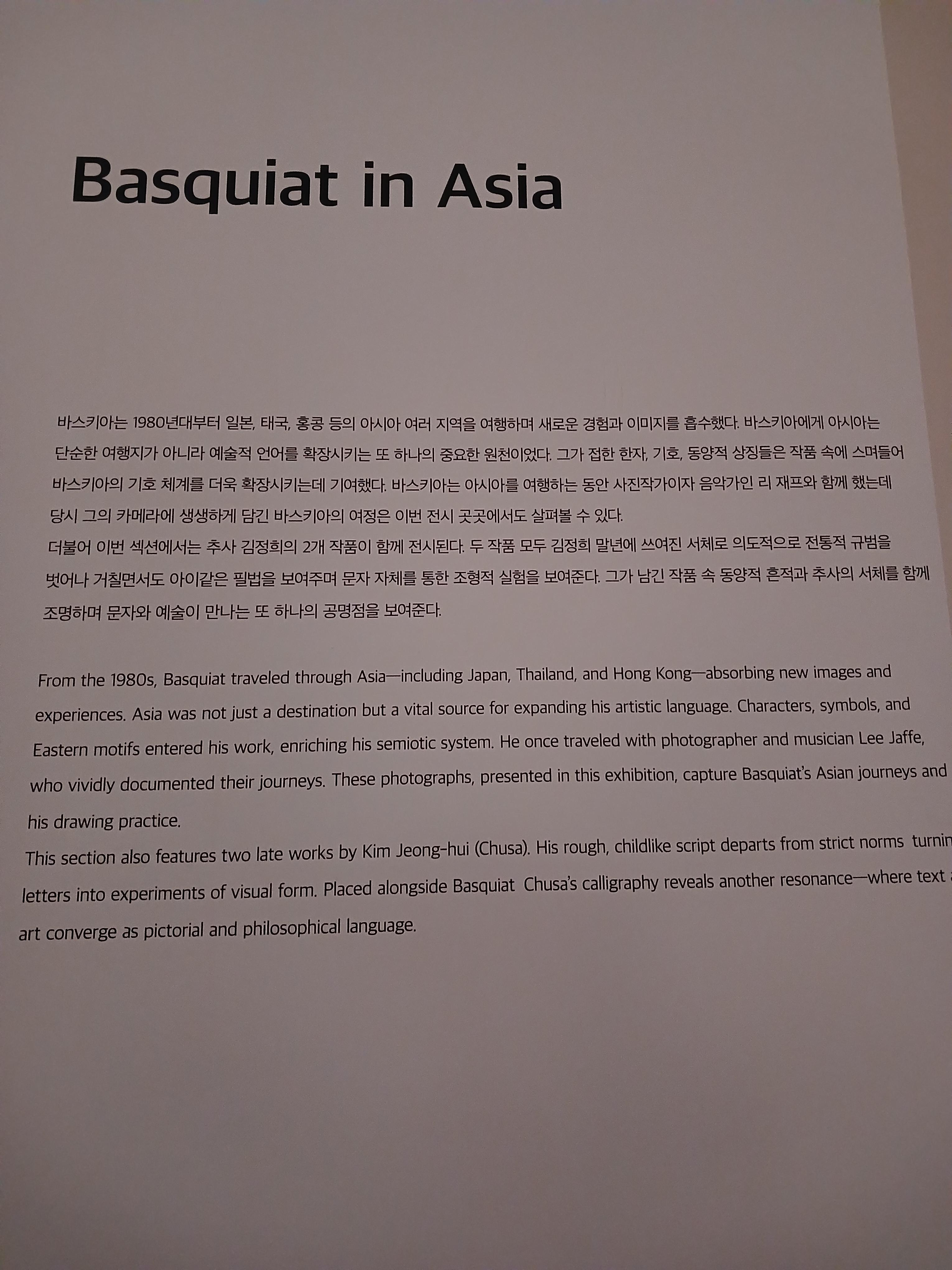 백남준이나 추사 김정희의 작품, 무신도 등 다른 한국의 작품들과 바스키아의 작품을 연관지어 전시해 놓았다.