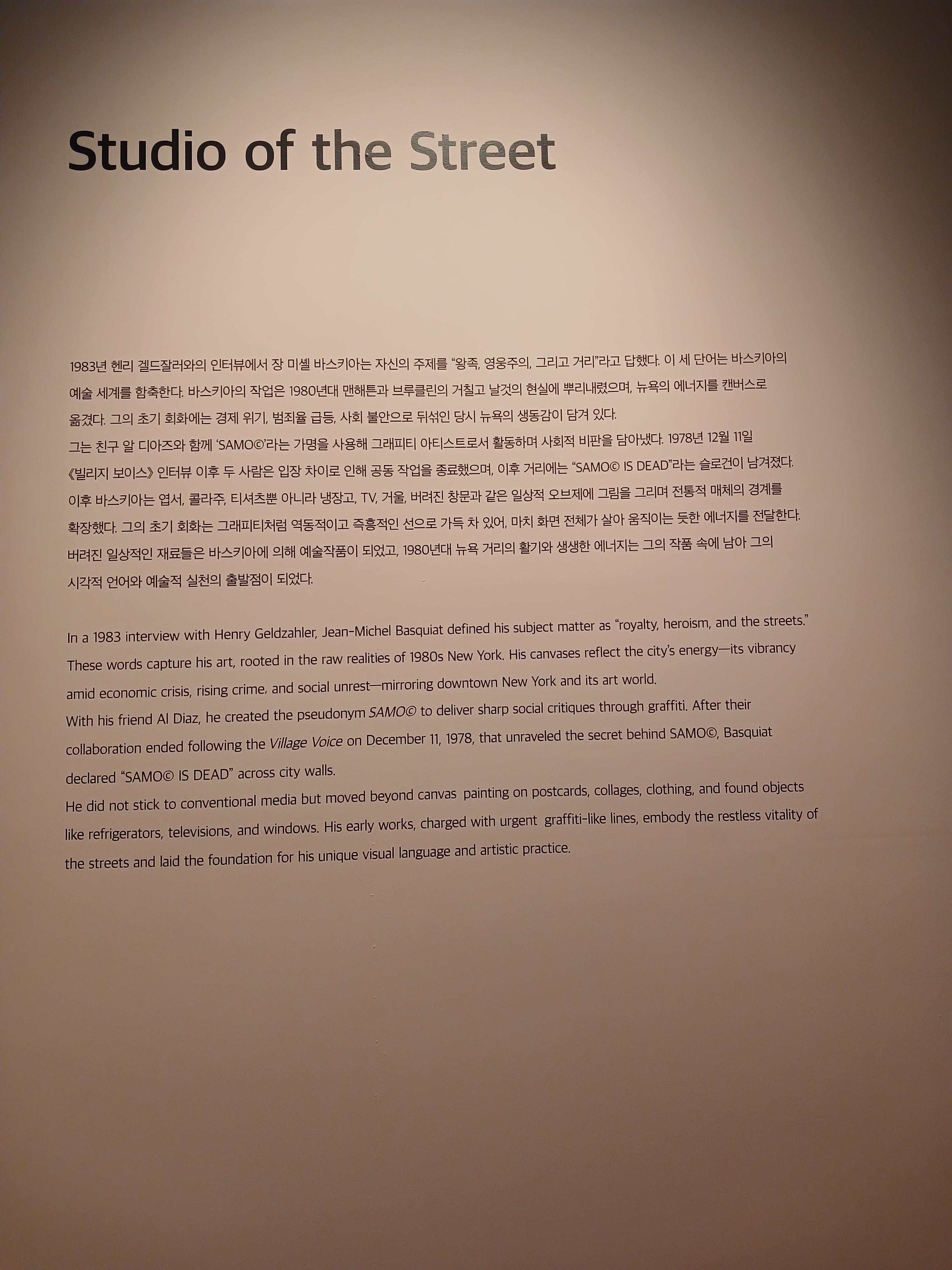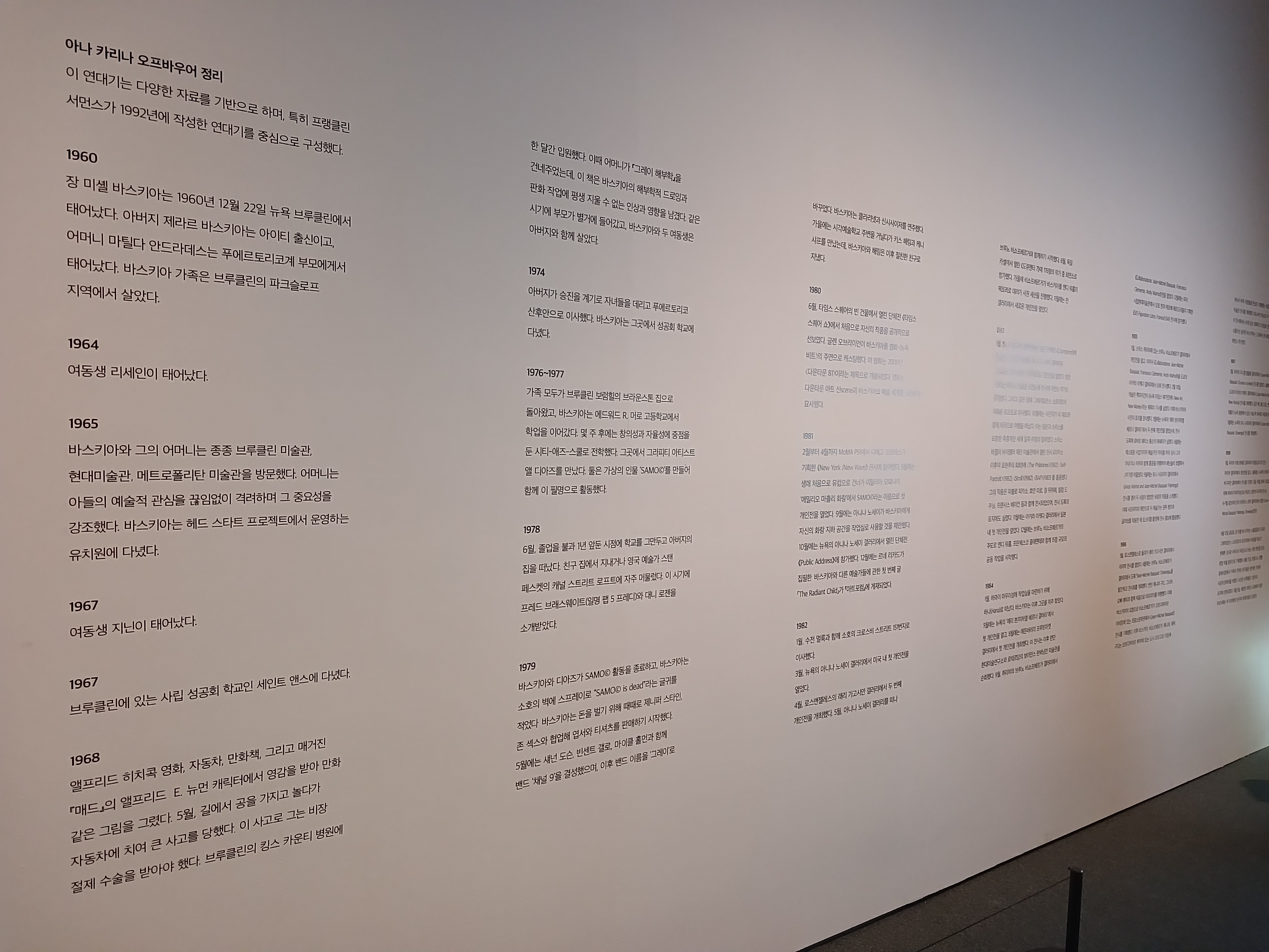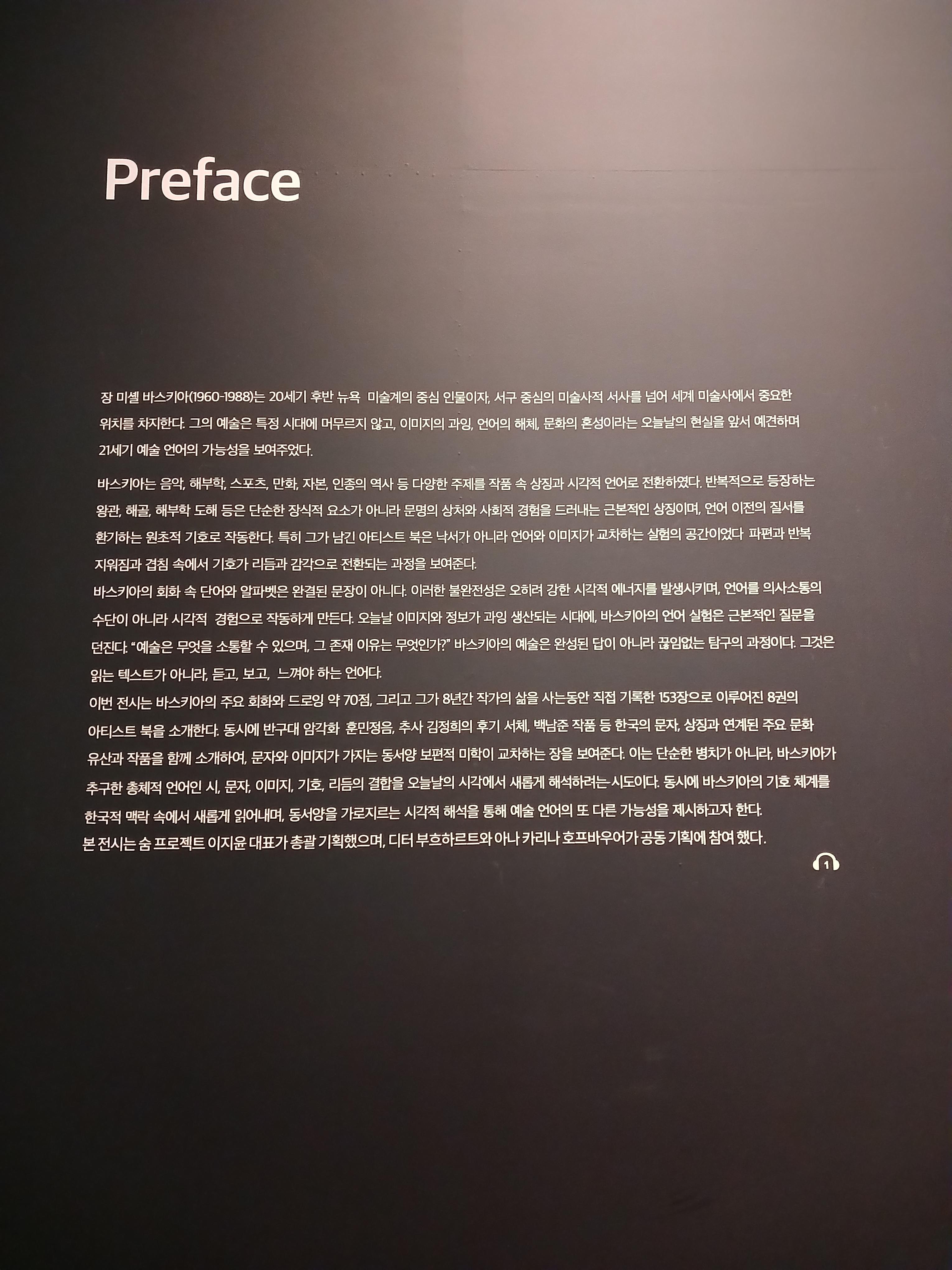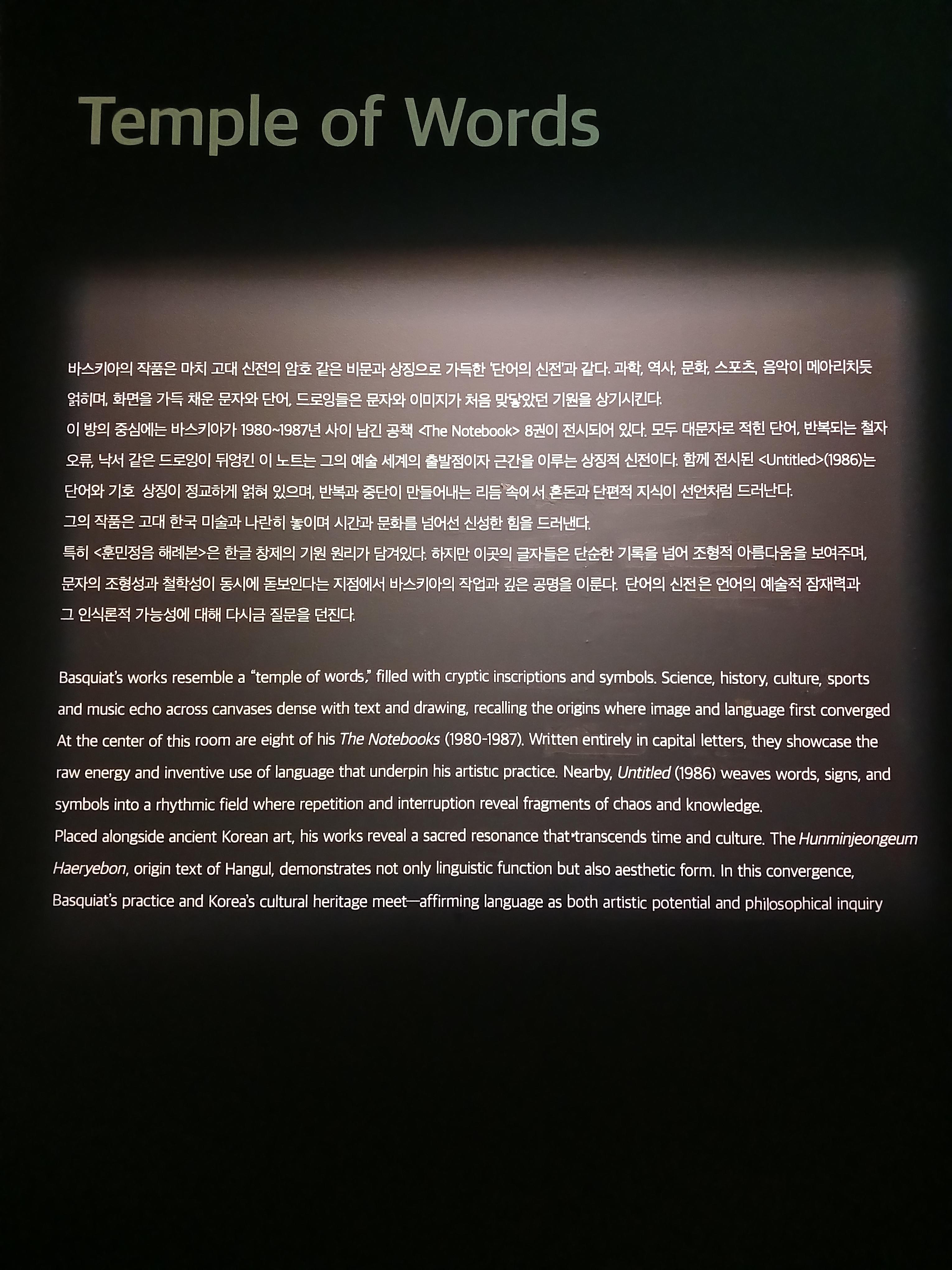 백남준이나 추사 김정희의 작품, 무신도 등 다른 한국의 작품들과 바스키아의 작품을 연관지어 전시해 놓았다.