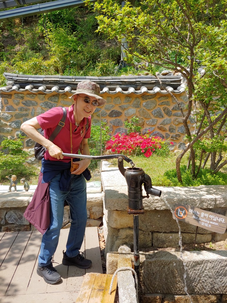어! 마중물을 넣으니 물이 제대로 나오는군요.
