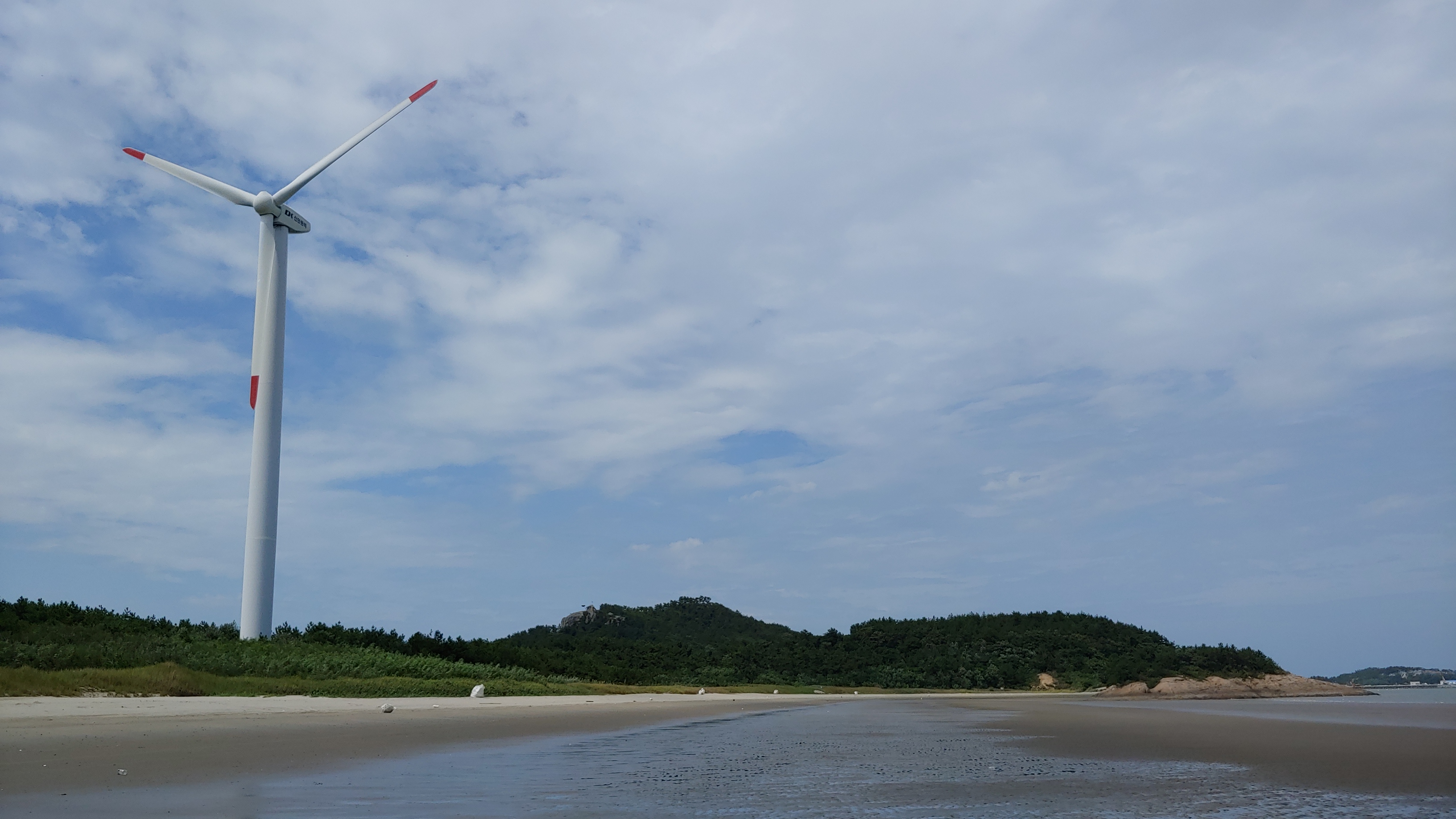 풍력발전기와 너른 해변이 근사한 풍광을 선사한다.