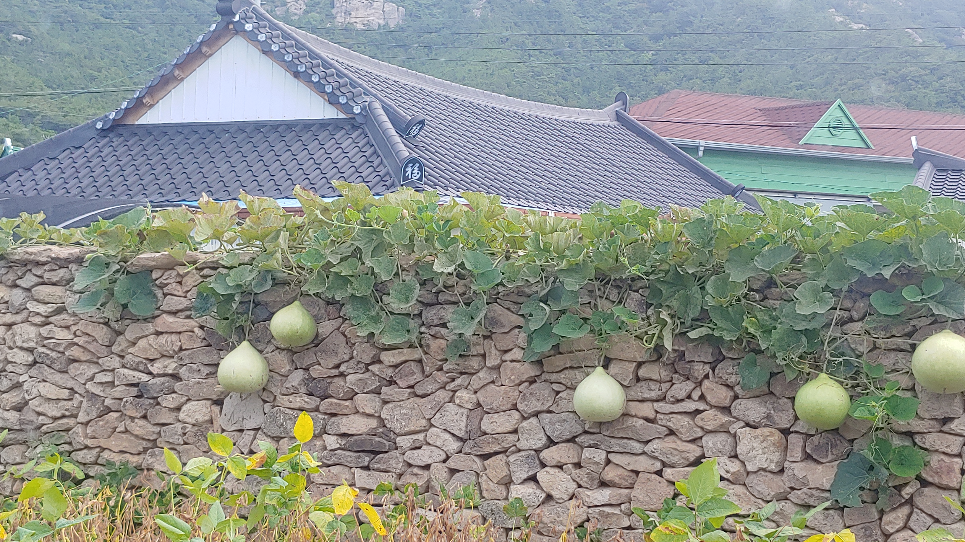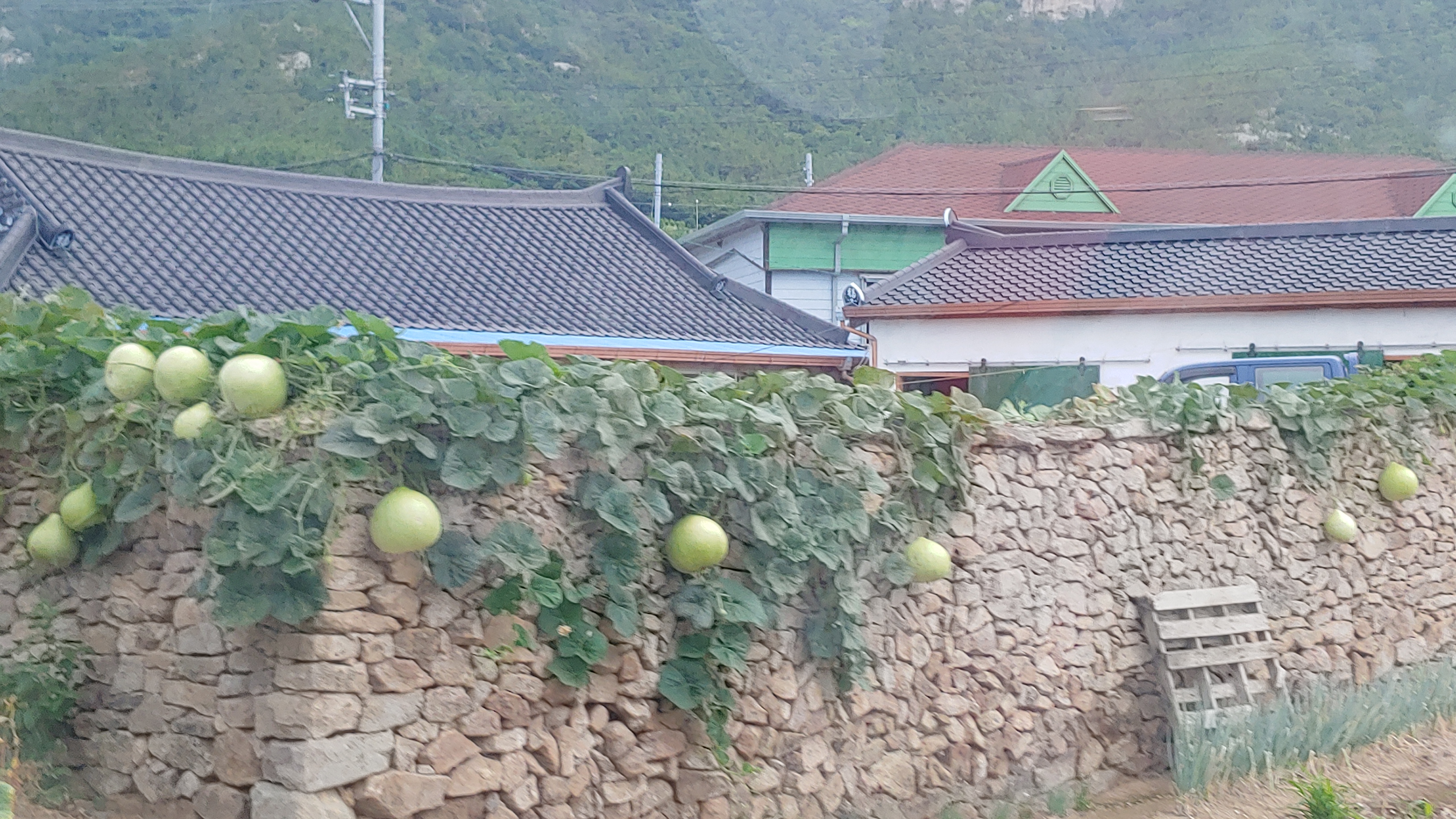 박이 탐스럽게 열려 있고 담장 아래 파도 자라고 있다.