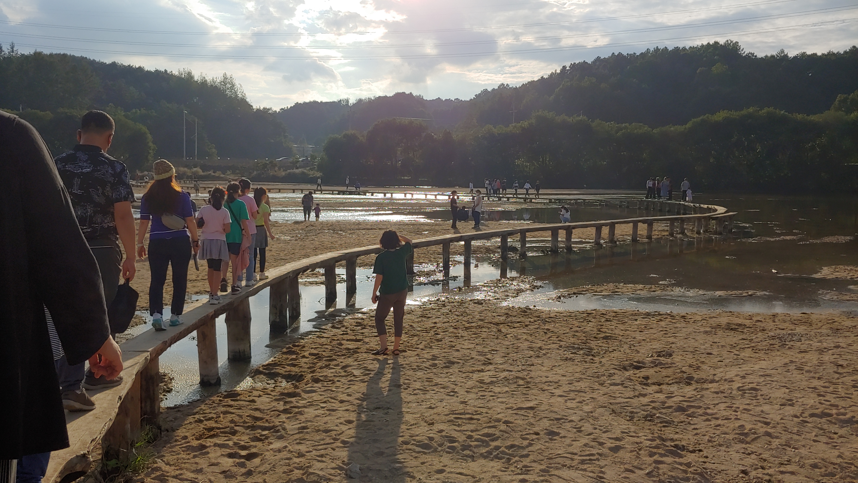 저녁이 가까운 시간임에도 사람들이 외나무다리에 줄을 섰군요.