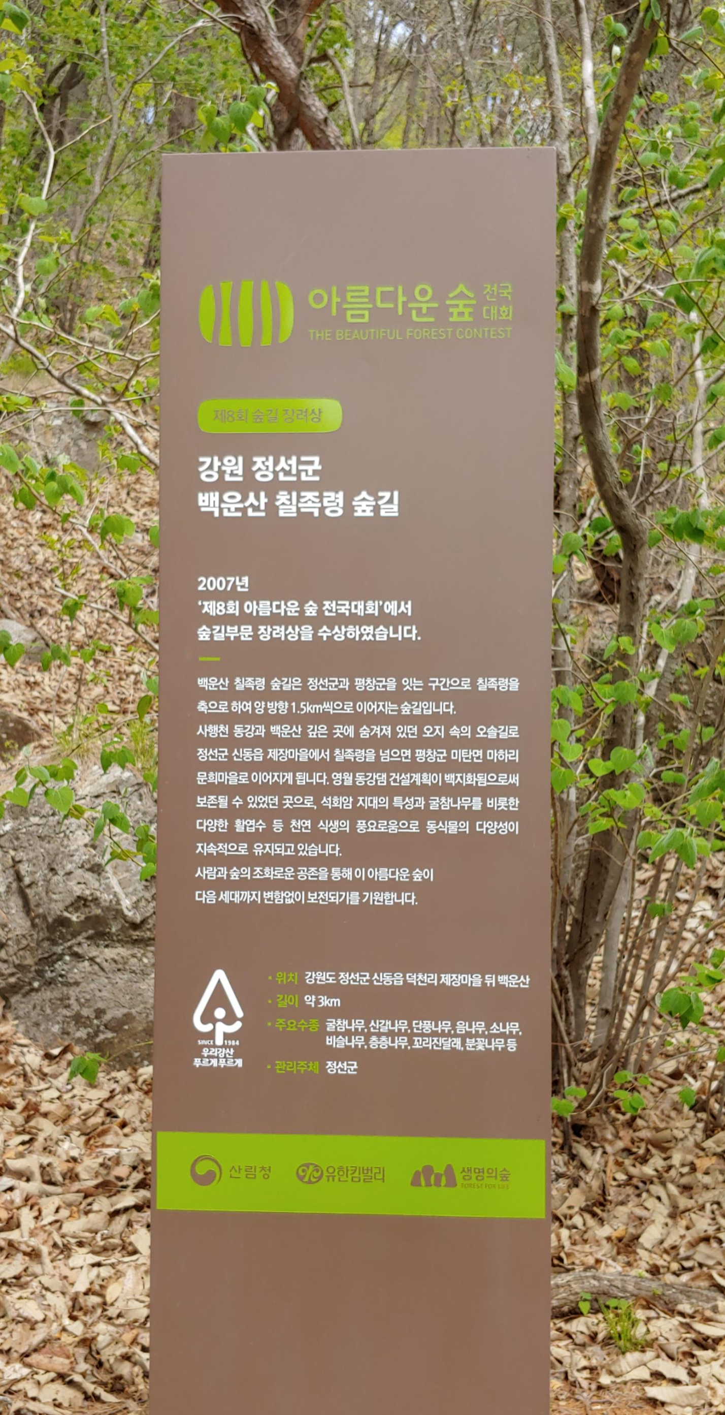 칠족령 숲길은 2007년 '제8회 아름다운 숲 전국대회'에서 숲길 부문 장려상을 수상했다는 안내문이 붙어 있다.