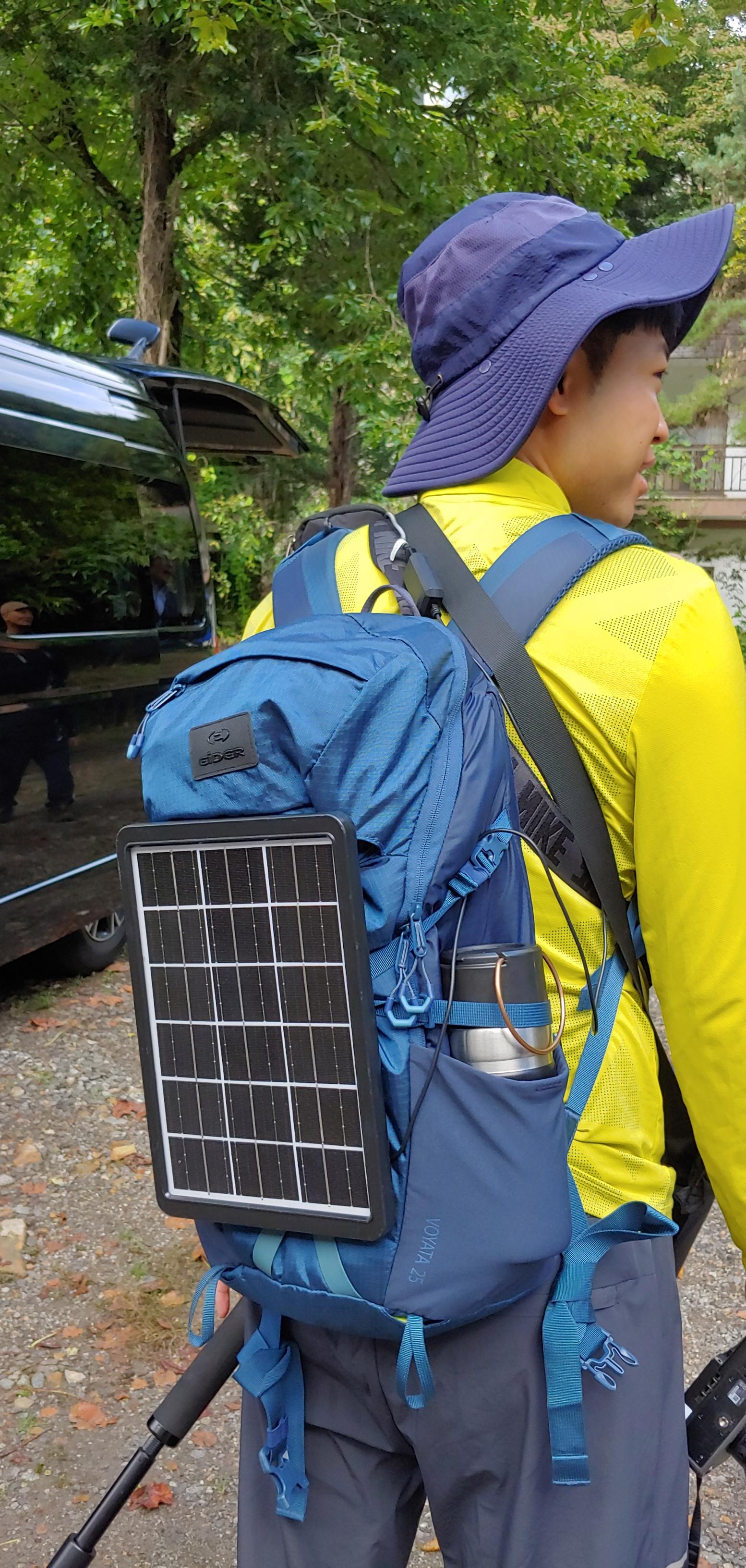 김PD 배낭에 태양광 전지판이 매달려 있다.