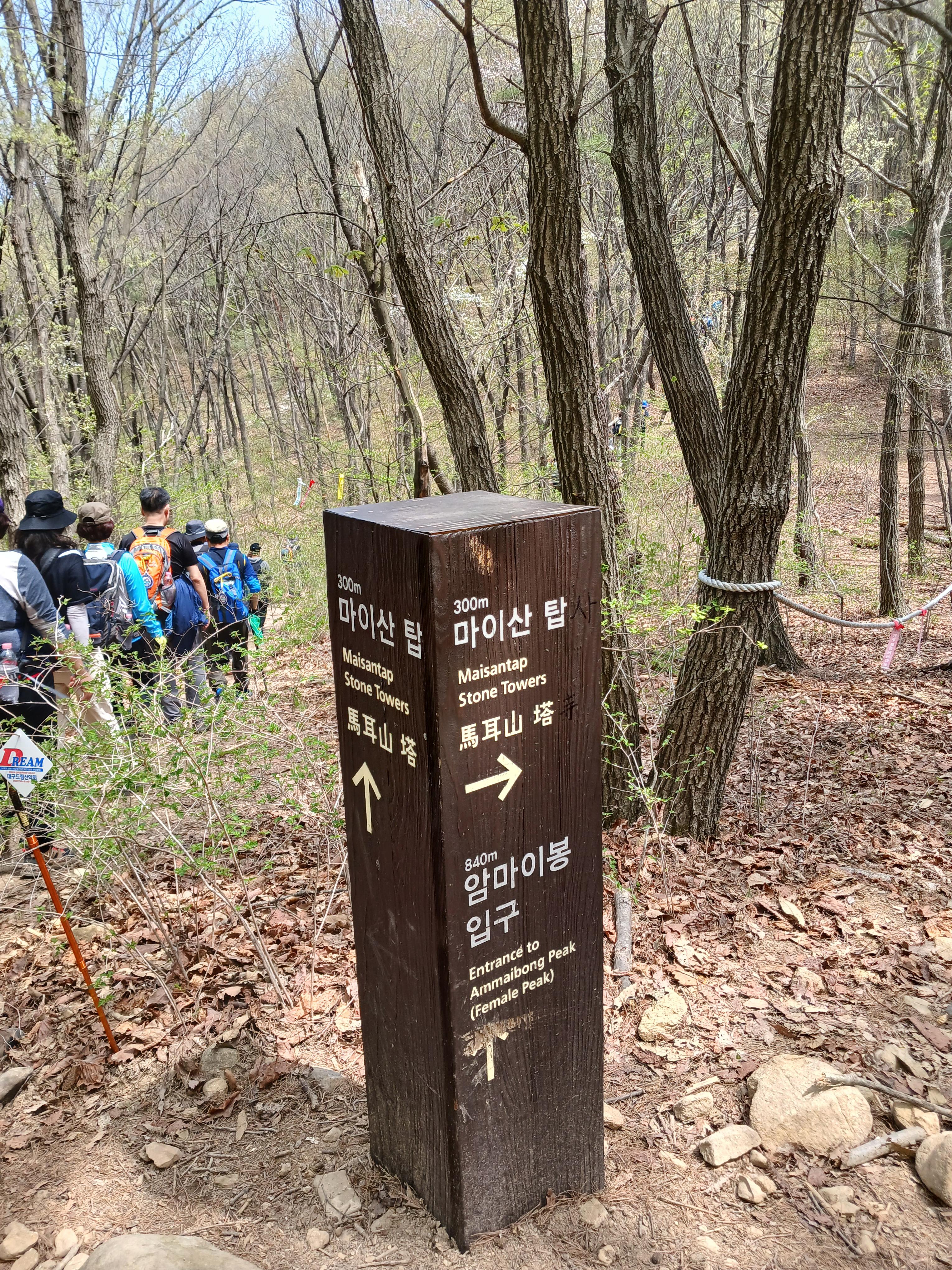 암마이봉(해발 686m)과 숫마이봉(해발 680m)이 나란히 있는데 암마이봉이 해발고도는 조금 더 높지만 둥그스름하고, 숫마이봉은 바위덩어리 세 개가 솟아 있는 형국인데 봉우리 끝이 뾰족합니다.