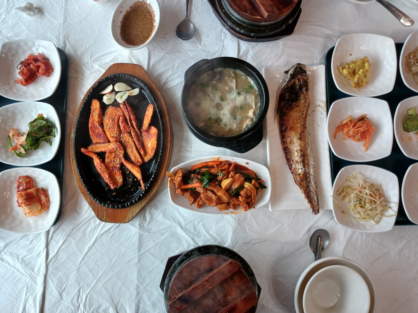된장찌개와 제육볶음에 고등어구이를 포함해 스무 가지 정도 되는 반찬이 식탁에 쫙 깔렸습니다.