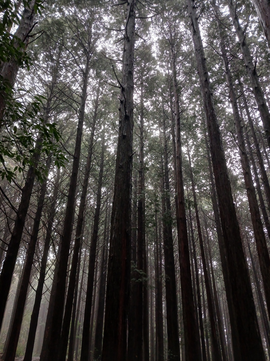 쭉쭉 뻗은 편백나무 사이로 파란 하늘이 보이면 좋으련만 우중충하게 안개만 자욱하다.