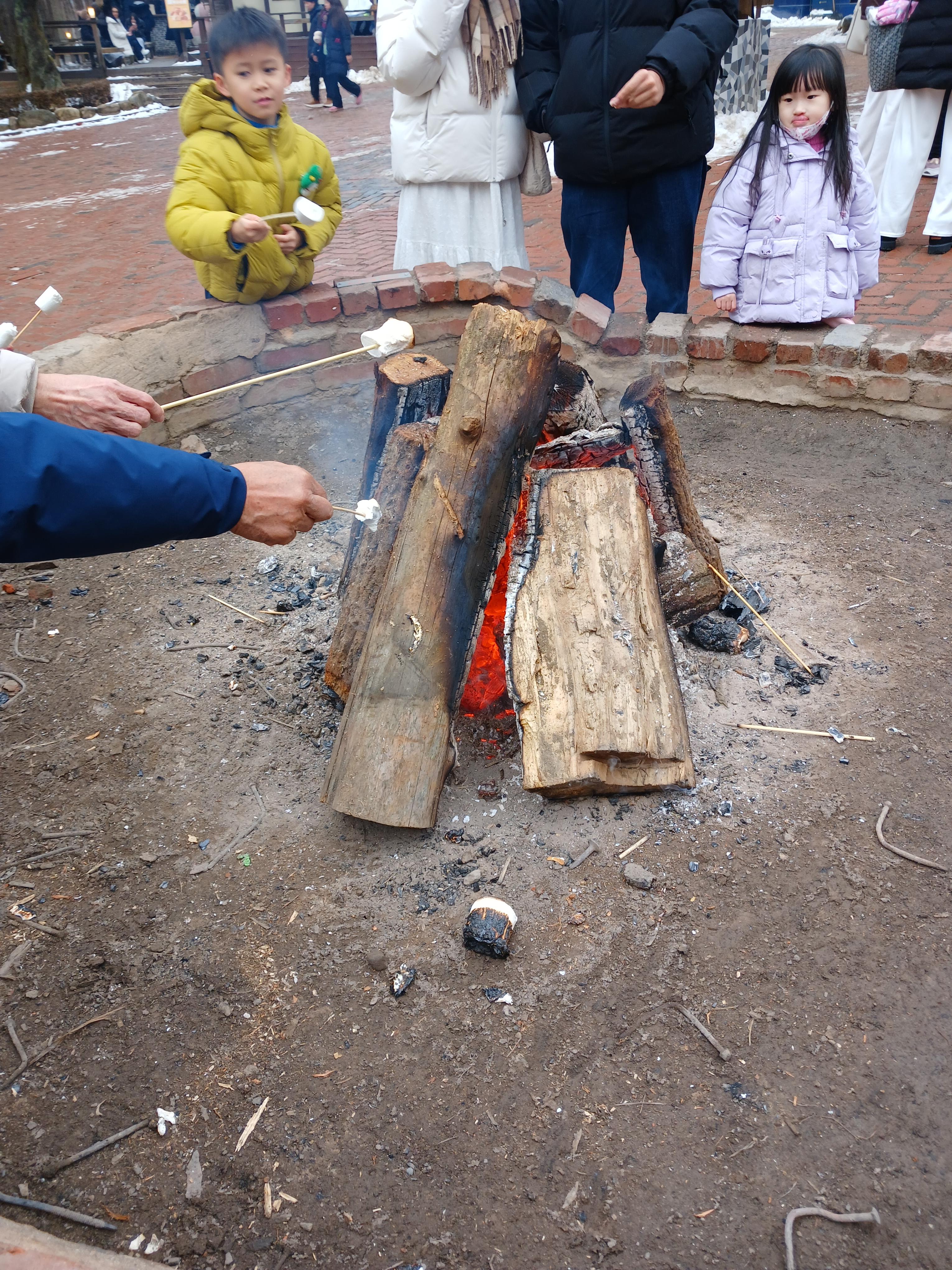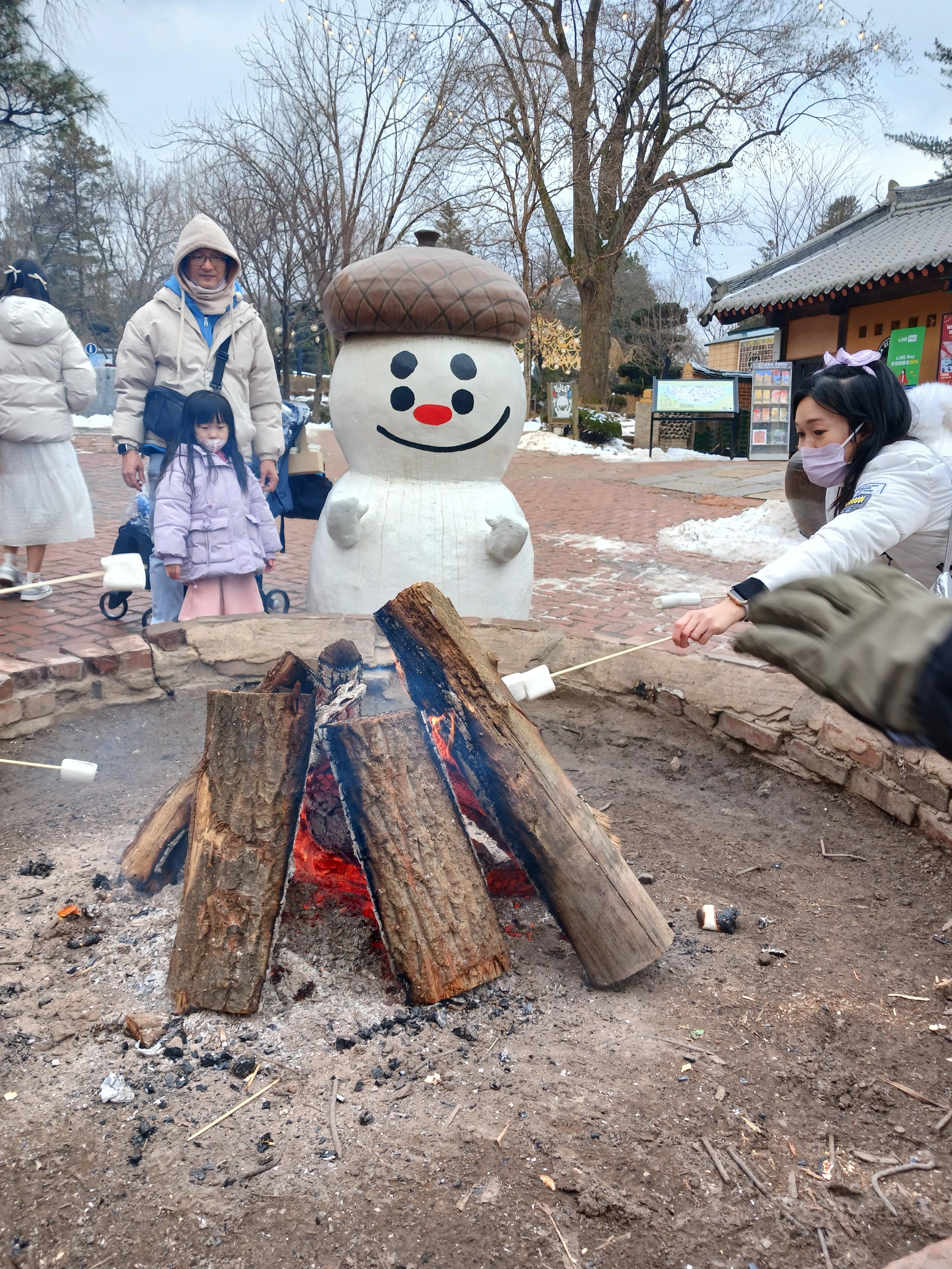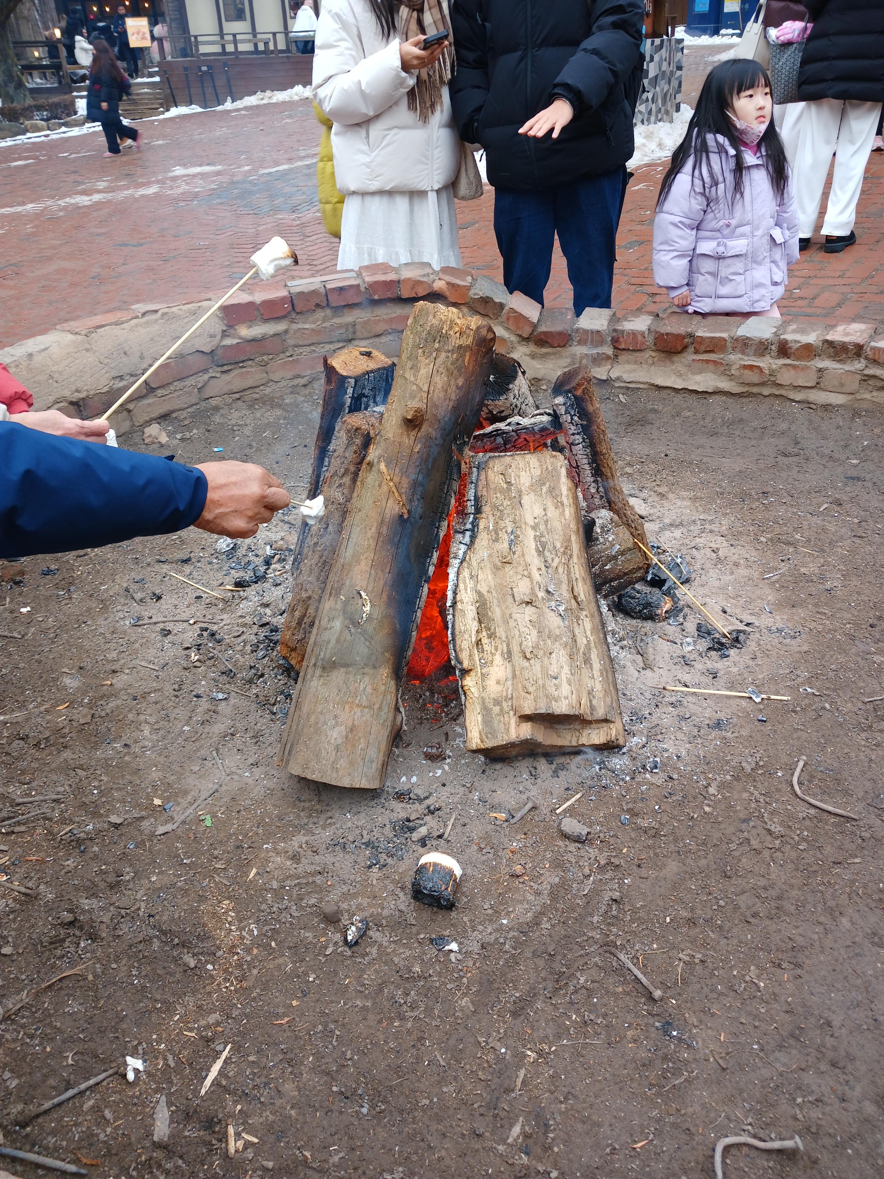 곳곳에 모닥불을 피워 놓았는데 거기에서 마시멜로를 구워 먹으며 '추억 만들기'를 하는 사람들이 많다.